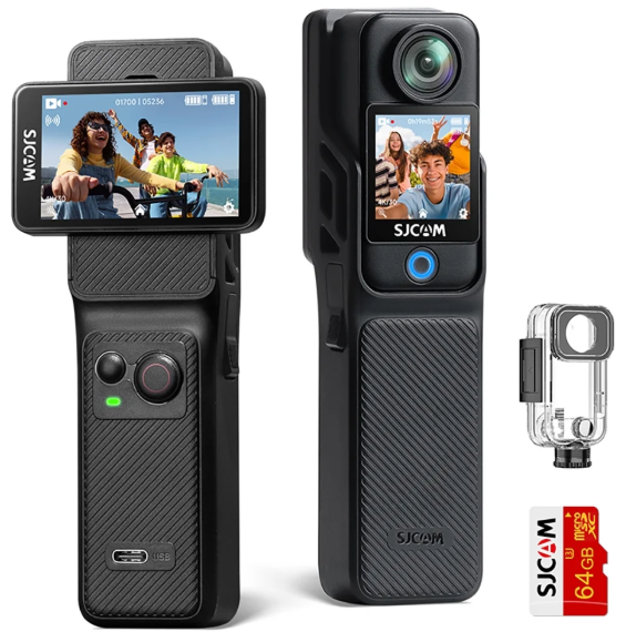 SJCAM C400 Camera Vlog Bundle (64G)-Caméra d'action 4K avec 7H d'Autonomie Exceptionnelle,Écran Tactile Rotatif 2.29",Imperméable,Stabilisation 6 Axes,pour Youtube,Vlog,Voyages,Activités,Noir